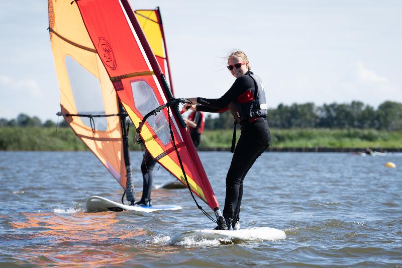 Para além da vela, também podes experimentar outros desportos náuticos no campo, como o windsurf! O lago não é muito profundo, o que torna a prática de windsurf mais fácil e acessível. Os mais experientes também encontram aqui desafios, por exemplo, nas manobras de beach start e water start. Todo o material é fornecido por nós, por isso não precisas de te preocupar com nada.