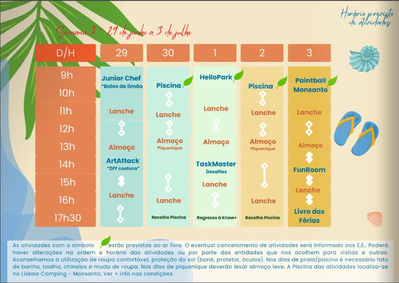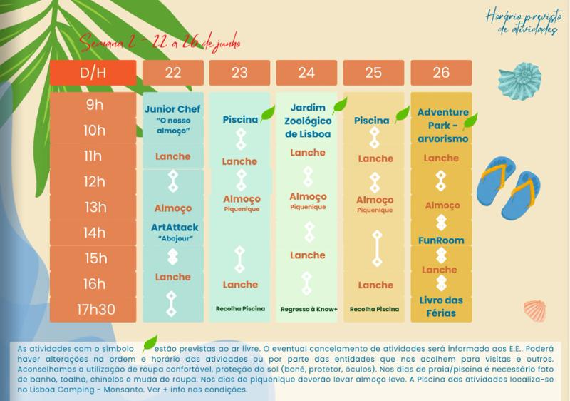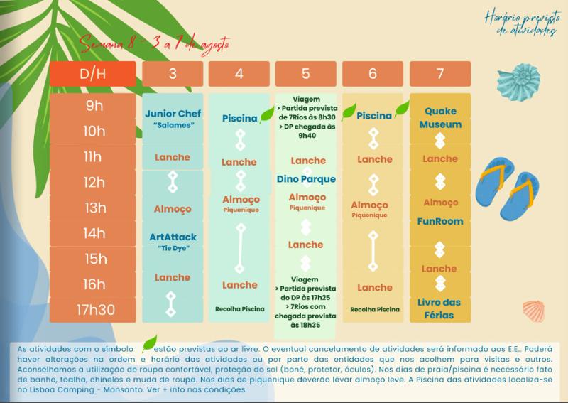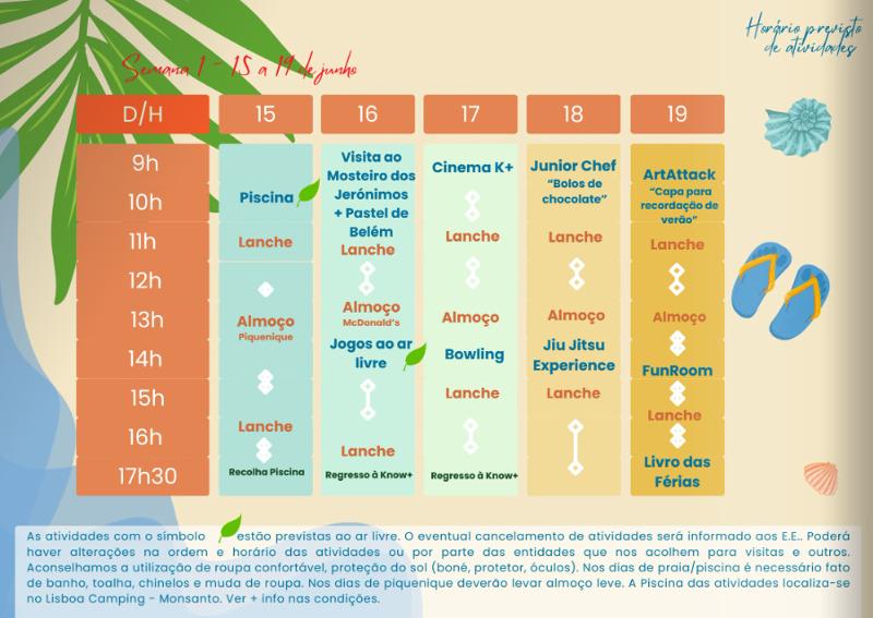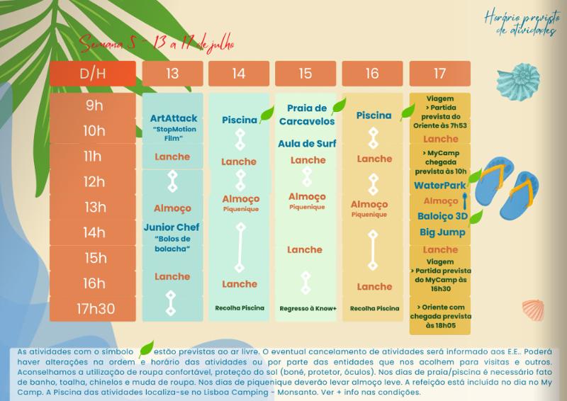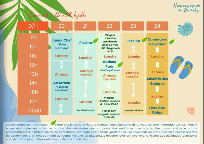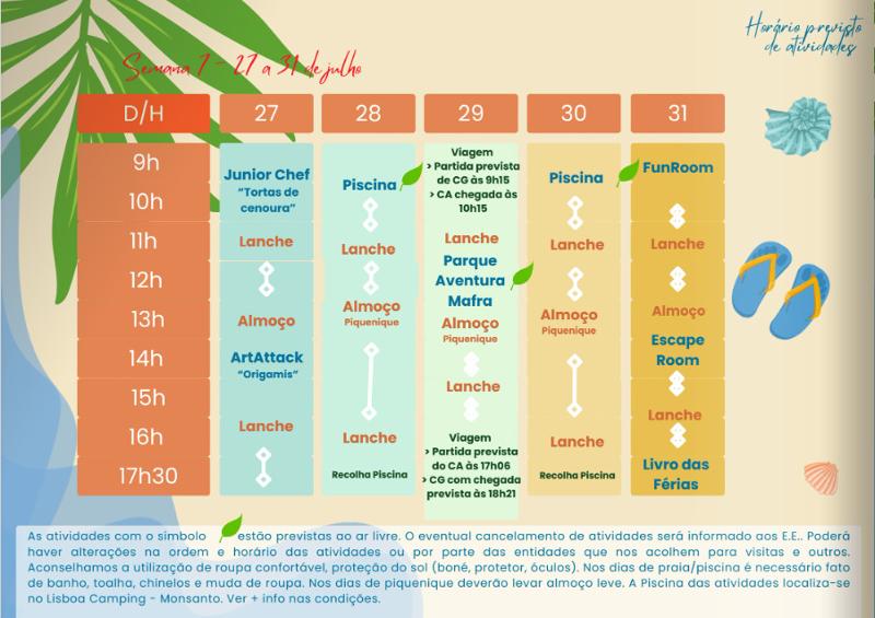 As atividades que têm um símbolo de uma folha, estão previstas decorrer ao ar livre. O eventual cancelamento de atividades será informado aos E.E. Poderão existir alterações na ordem e horário das atividades ou por parte das entidades que recebem os participantes do campo de férias.