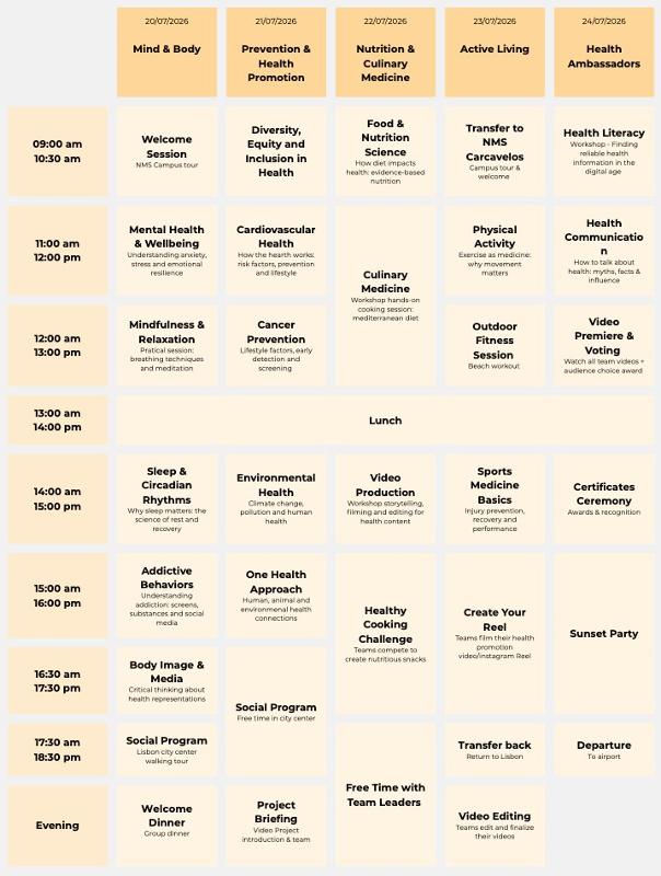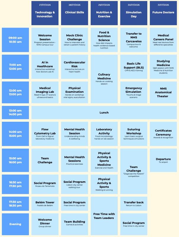 Vive uma experiência única em Lisboa, onde a ciência, a inovação e a medicina se juntam para te dar um verão inesquecível. Aprende com especialistas, desenvolve novas competências e conecta-te com jovens de todo o mundo numa experiência imersiva no universo da saúde e bem-estar.